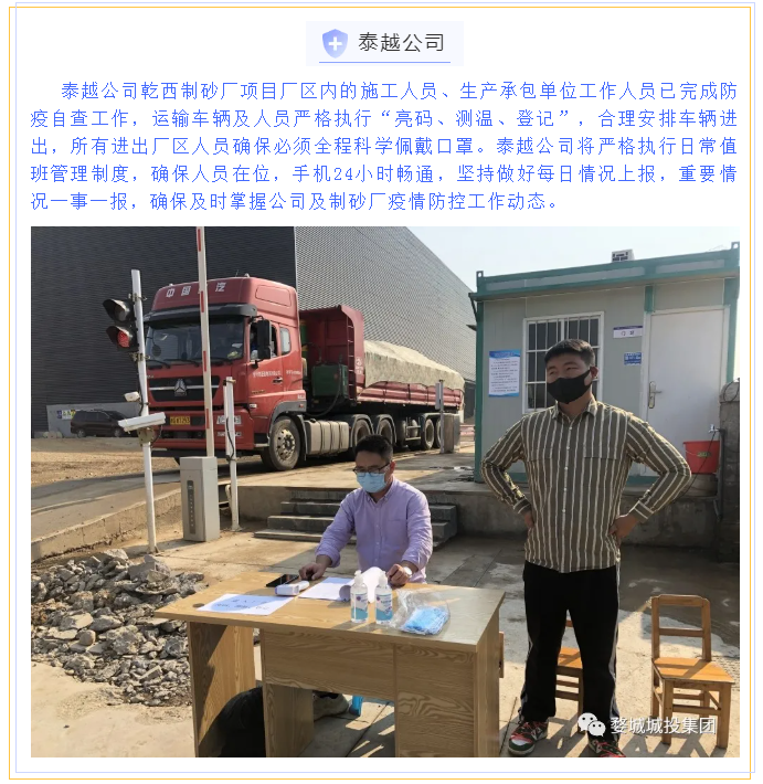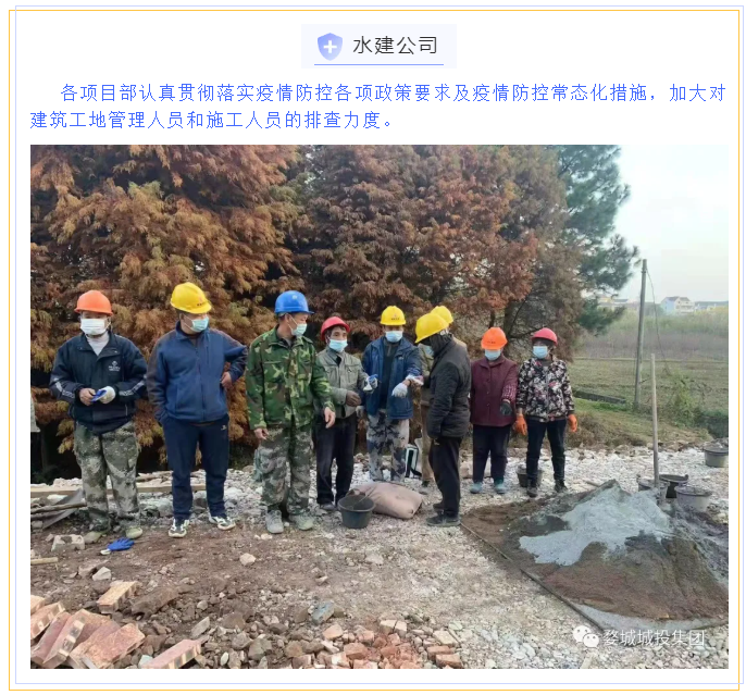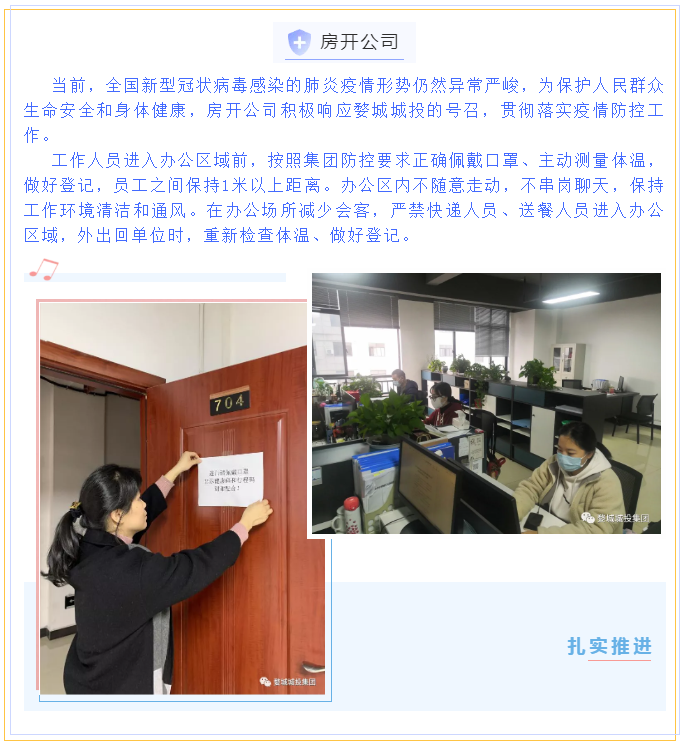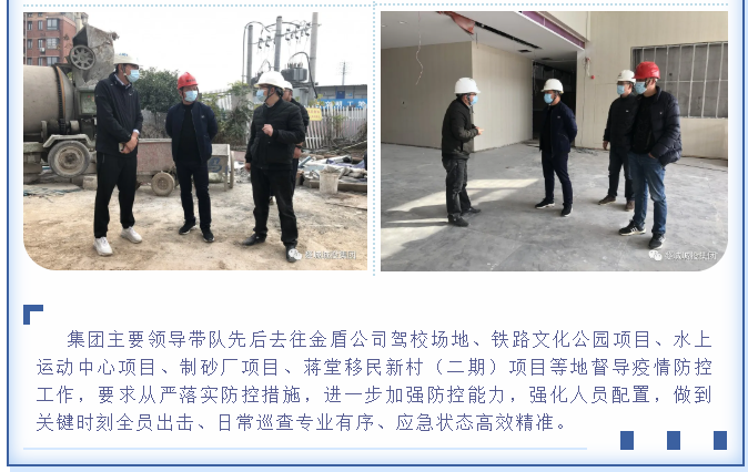 為貫徹落實省、市、區(qū)疫情防控工作視頻會議精神,婺城區(qū)城投集團全員行動,在集團疫情防控工作體系的框架下,分別以職能部門和子公司、項目為主體,制定切合實際、有操作性的疫情防控方案,同時組織紀檢專班力量,成立督查應急小組,對各工地(項目)疫情防控措施設置情況進行督查督辦,集團上下全面緊起來、嚴起來,疫情防控工作氛圍濃郁。