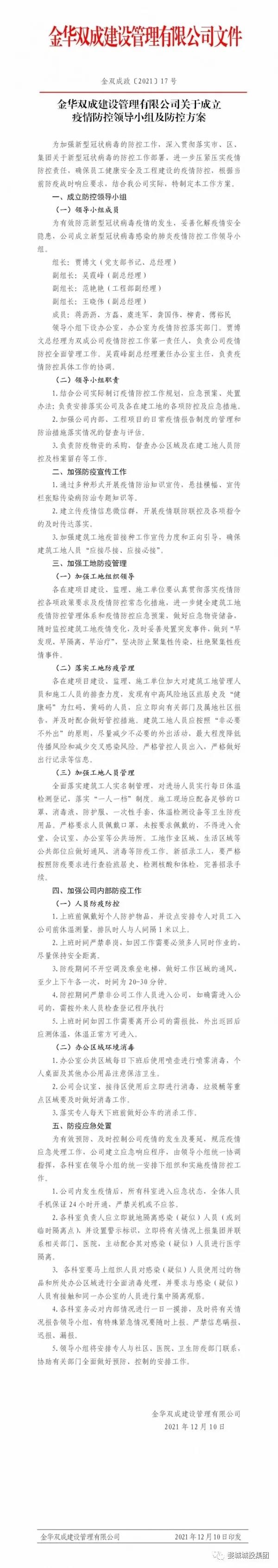 繼省、市、區(qū)疫情防控工作視頻會議召開后,婺城區(qū)城投集團深刻認識到疫情防控形勢的嚴峻性、復雜性、緊迫性,從“平時”模式轉入“戰(zhàn)時”機制,12月11日,集團全面部署、立即落實,第一時間印發(fā)《關于進一步健全完善疫情防控工作體系的通知》,制定《金華市婺城區(qū)城鄉(xiāng)建設投資集團有限公司疫情防控督查表》,在周末全員不休,集中精力開展重點項目和主要場所疫情防控攻堅的基礎上,組織其余干部職工前往聯(lián)系社區(qū),會同社區(qū)工作人員開展疫情防控工作,壓緊壓實責任,以鐵的擔當、鐵的紀律對疫情防控工作進行再細化、再落實,一鼓作氣堅決打贏這場疫情防控阻擊戰(zhàn)。